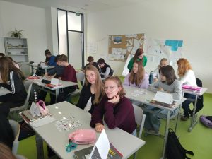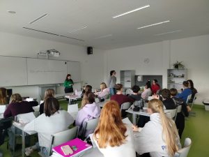 Výuku jsme vedly ve třídě 1.A, jejíž úroveň byla přibližně A1.1. Náplní hodiny byl úvod do tématu „Hobbys“ a gramatika modálních sloves „wollen“ a „müssen“. S využitím učebnice jsme pro žáky připravily pracovní list s různými cvičeními a úkoly. Na závěr hodiny jsme zařadily interaktivní pexeso, které mělo podle zpětné vazby žáků největší úspěch. Po celou dobu jsme pracovaly s prezentací, pomocí které jsme promítaly správné výsledky a doplňovaly výklad.