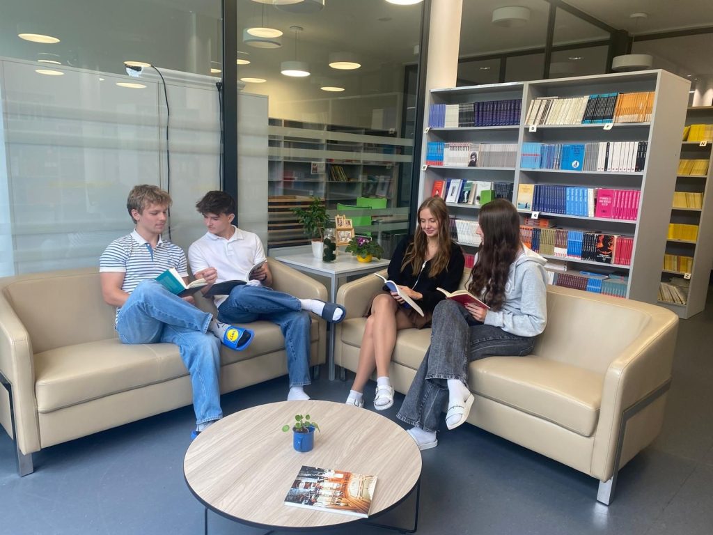 Naše knihovna je sice menší, její fond je však velmi bohatý. V katalogu je evidováno přes deset tisíc titulů, dalších více než dvanáct tisíc kusů tvoří školní učebnice ve správě knihovny. K dispozici je beletrie v češtině, němčině a angličtině, menší část fondu je také ve francouzštině a španělštině.