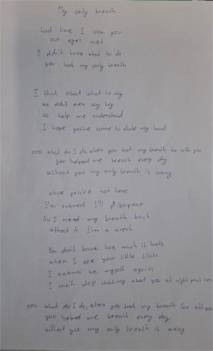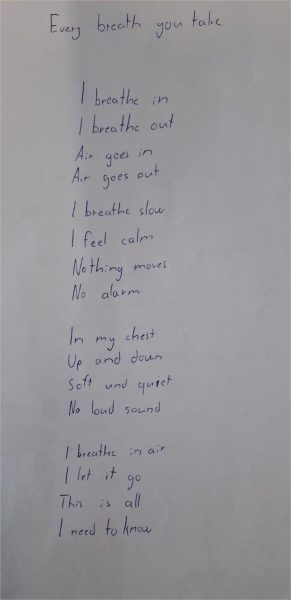 Danach verfassten die Schülerinnen und Schüler ihre eigenen Liedtexte bzw. Gedichte, die in irgend einer Weise etwas mit Atmung zu tun hatten und präsentierten diese der Klasse.