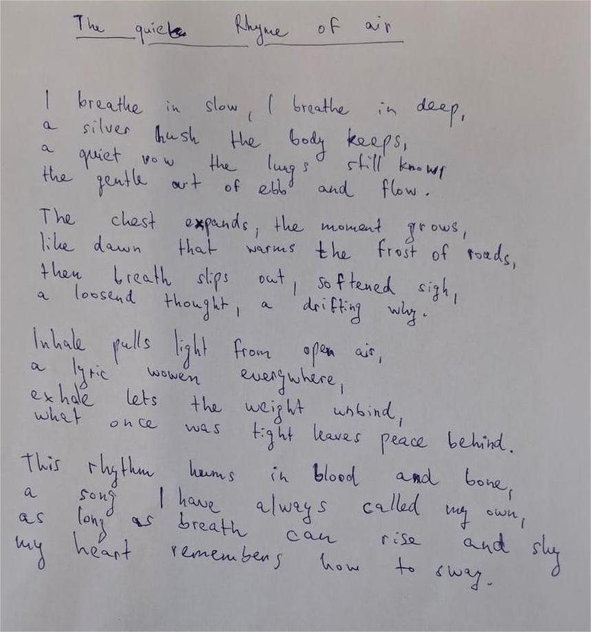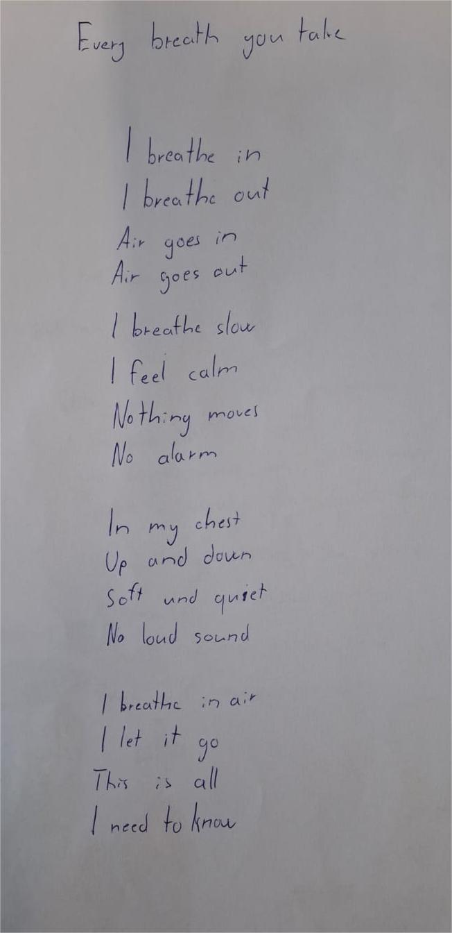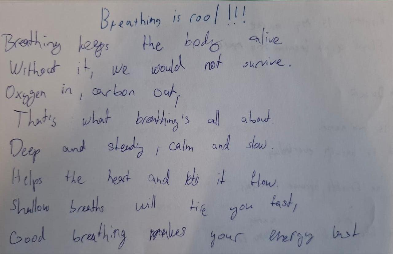Danach verfassten die Schülerinnen und Schüler ihre eigenen Liedtexte bzw. Gedichte, die in irgend einer Weise etwas mit Atmung zu tun hatten und präsentierten diese der Klasse.